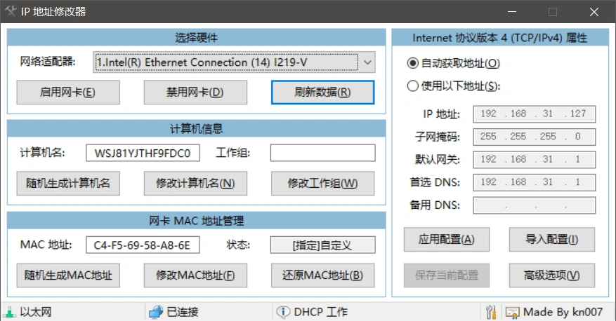 • 如其名,可以方便的进行IP地址,网卡MAC等修改,支持多网卡,并且支持管理导入多份配置,同类工具中的翘楚。